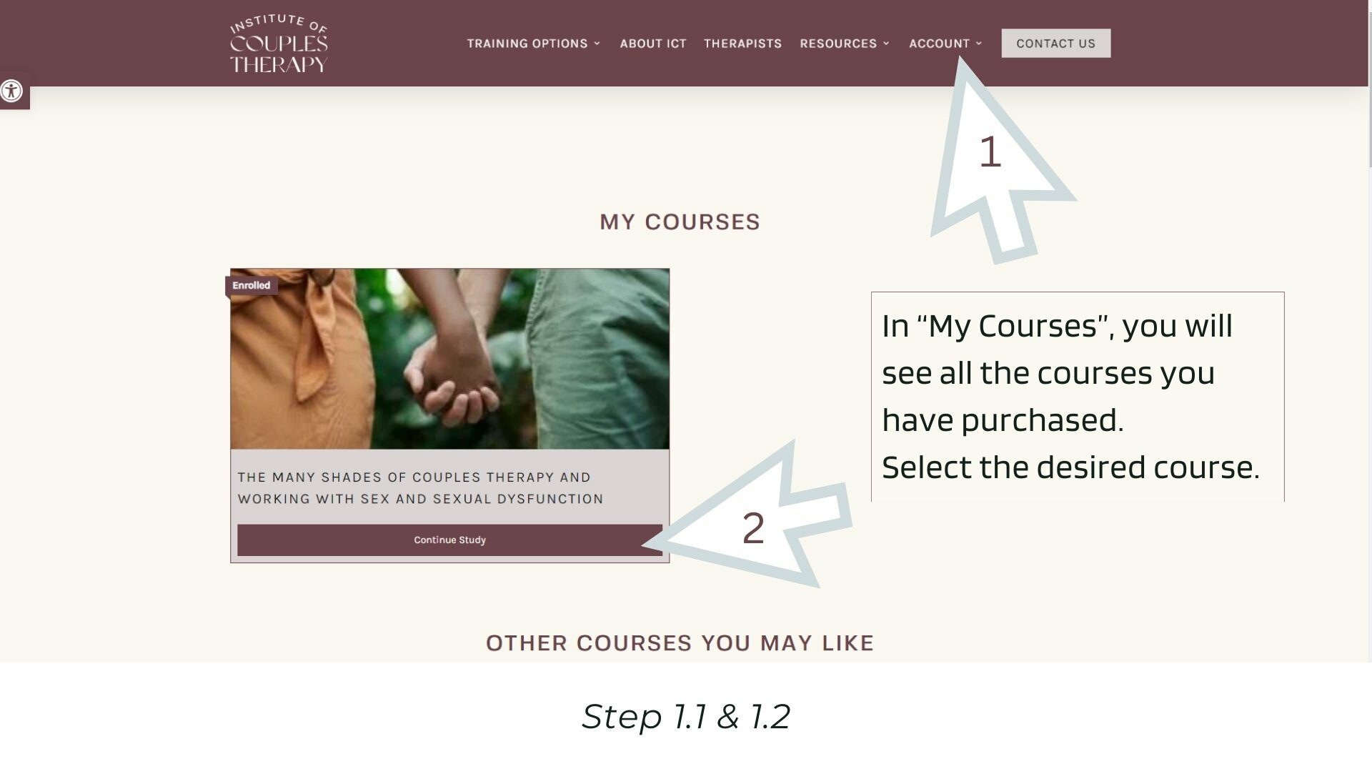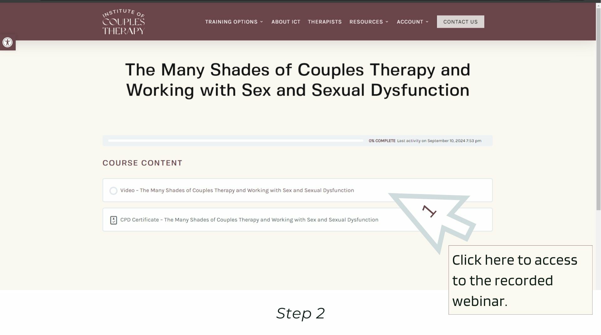 Welcome! We’re thrilled you’ve chosen the Institute of Couples Therapy to further your professional development. Accessing your purchased courses is the first step in expanding your skills and knowledge. We’re here to ensure the process is as seamless as possible. Simply follow the steps below to start your learning journey and make the most of the resources available to you.
