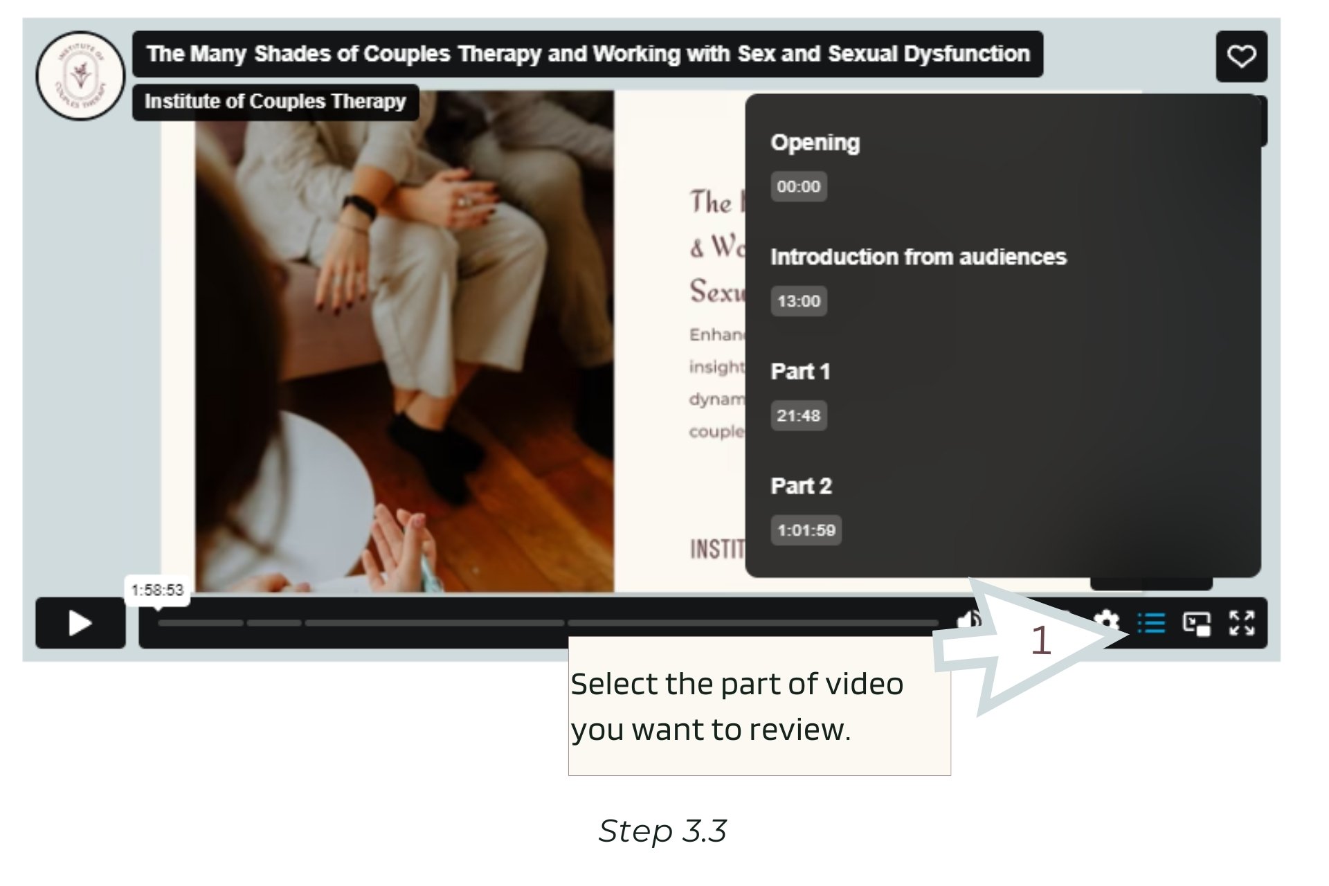 3. The webinar is broken down into sections (if applicable) for your comfort when revisiting lessons. Hover on the chapter icon (third icon from the left) on the interactive bar of the video and select the part you want to review.
