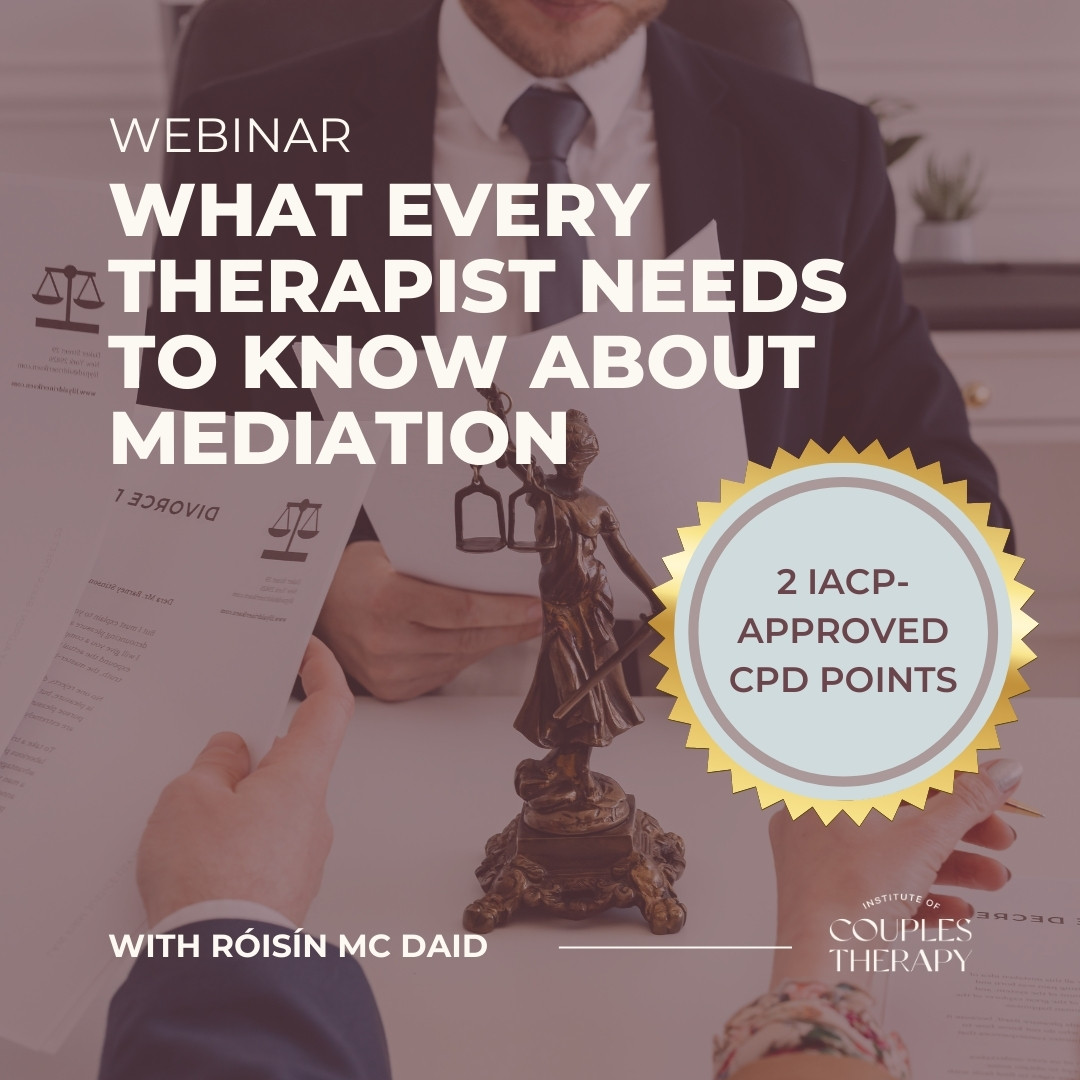 The Institute of Couples Therapy is delighted to welcome Róisín Mc Daid, founder of Coast Mediation and Consultancy, to share her expertise and insights into this vital process. In this two-hour webinar, Róisín will guide participants through: